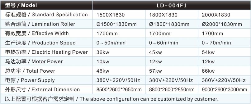 | 紙品復(fù)合機(jī)/貼合機(jī)-紙品復(fù)合機(jī)/貼合機(jī)LD-004F1主要技術(shù)參數(shù) / Major technical parameters |