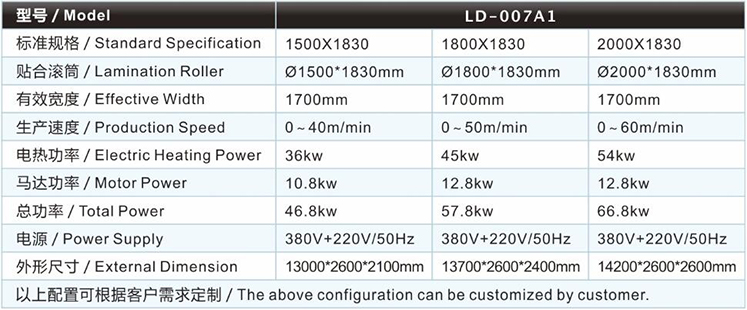 | SBR復(fù)合機/貼合機-單輪SBR復(fù)合機/貼合機LD-007A1主要技術(shù)參數(shù) / Major technical parameters |