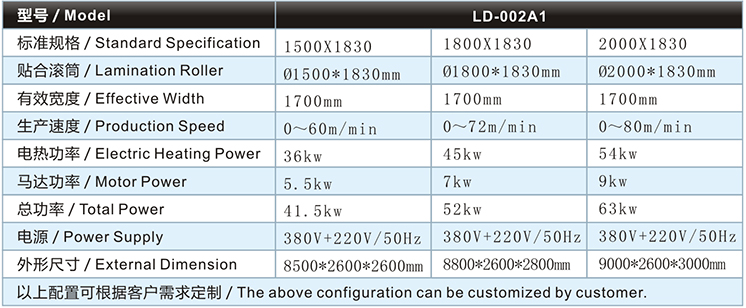 | 汽車用品復合機/貼合機-橫式單槽水膠網(wǎng)帶復合機/貼合機LD-002A1主要技術(shù)參數(shù) / Major technical parameters |