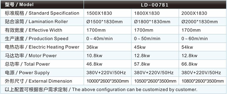 | SBR復(fù)合機(jī)/貼合機(jī)-單輪SBR復(fù)合機(jī)/貼合機(jī)LD-007B1的主要技術(shù)參數(shù) / Major technical parameters |